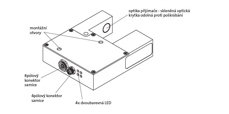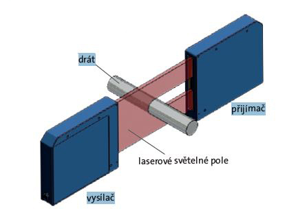 Vysílač emituje rovnoběžné laserové paprsky, měřený objekt vytváří na přijímači stín, který je detekován senzorem.